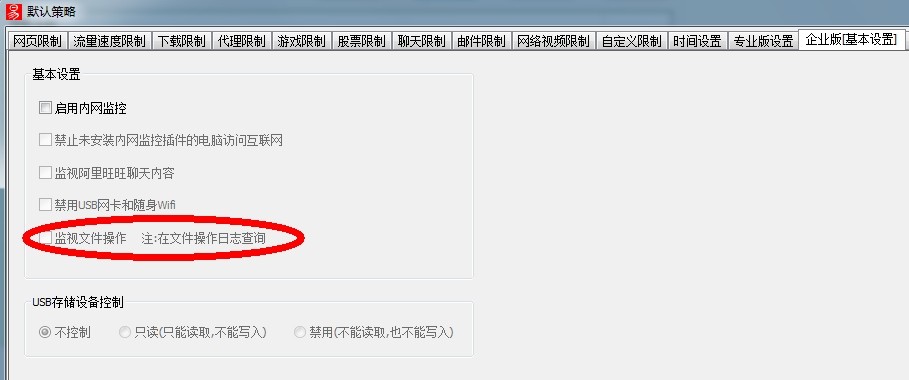 找到“企业版基本设置”选项,勾选“启用内网监控”——“监控文件操作”即可:
