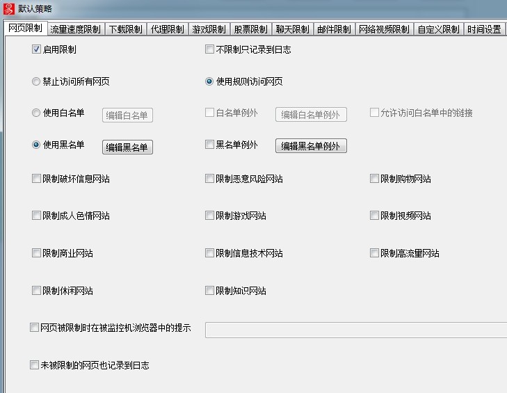 多年以来,天易成局域网监控软件凭借其功能全面、操作简单等优势,屹立于同类软件群,成为广大识货用户的宠儿。天易成局域网监控软件有标准、专业、企业三个版本, 其中,标准版所涵盖的功能,是最基础,也是用户需求最多的版本,价格较其余两个版本最低,下面,我们就来介绍下标准版的功能。 1、四种部署模式:ARP网关,网桥方式,单网卡网关,双网卡网关,用户可根据自身实际情况选择适合自己网络环境的模式。 网页限制,下载限制,游戏限制,股票限制,聊天限制,邮件限制,网络视频限制等,这些功能都只需要勾选即可实现。部分限制规则如下图: 2、启用限制:禁止使用所勾选的软件。 不限制,只记录到日志:勾选的软件可以使用,但会被记录下来,在日志里面可以查询。 3、管理开启arp防火墙的电脑:突破所有arp防火墙管理电脑。在没有这个功能之前,使用天易成局域网监控软件管理开启了arp防火墙的电脑,会出现对方断网的情况, 解决办法只有关闭其arp防火墙,很不方便,现在增加了这个功能,这些顾虑便不复存在。 4、监控机定时开关机 软件跟电脑主板配合,可以做到上班前定时开机自动开始管理,下班后自动关闭断网,无需手动开关机、打开软件、开始管理等,大大加强了软件的自动性和智能性。 5、速度、流量限制:精确控制某台电脑的下载/上传带宽以及总上网流量 不仅下载带宽需要控制,上传带宽同样需要,因为ADSL上传带宽一般很小,视频软件基本使用UDP协议,没有拥塞控制机制,且开机后即在后台上传数据,上传带宽耗尽上网就慢了,所以需要限制电脑的上传带宽。 同时,天易成局域网监控软件还可以设置被控机一天上网的总流量,使用完后被禁止上网。 6、IP-MAC绑定 此功能仅适用于固定IP地址的网络环境,阻止修改了IP地址的电脑上网。但在DHCP网络环境下,IP地址是随机分配的,故不能使用此功能。 7、自动发现电脑并开始管理:若局域网有新的电脑加进来,会自动加载策略,并开始管理,无需手动指派策略。 8、其它功能: 集成远程协助 软件集成了远程协助的功能,远程解决用户的问题。 电脑攻击报警 对局域网内的ARP攻击进行报警 强制电脑断网 对指定电脑进行强制断网 监视方式管理 不禁止被管理电脑上网,但会记录其上网行为 跨网段(VLAN)管理 支持多网段管理 自定义管理规则 可以自定义IP与端口进行封堵 时间设置 每个电脑最多可设置4个策略,可分时段使用不同策略。 日志查询 查询之前所记录的日志