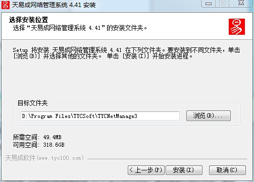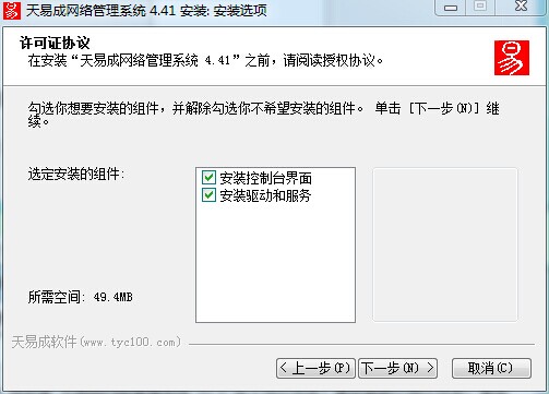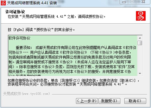 1.运行安装程序TYCNetManage4.41.exe。(本教程适用于天易成网管软件3.0及以上版本) 2.点击下一步,阅读软件许可协议,点击“我接受” 3.选择需要安装的组件。 天易成网管软件采用C/S架构,局域网内任一电脑都可以连接到监控机使用软件。 “驱动和服务”作为系统服务在后台运行,起实际管理作用。监控机必须安装,被监控机可选择安装。 “控制台界面”即软件界面,起配置和查看作用,用户可根据需要选择安装。 4.选择软件安装目录。完成后点击“安装”。 5.选择信任驱动。 6.设置软件的使用密码。 此密码既是软件登录密码,也是被控机连接监控机时所需要的密码,用户自己设定。 7.安装完成,重启电脑。