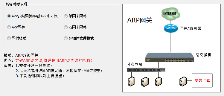 众所周知,现在许多网管软件都会有不同的管理模式,每种模式都有各自的优缺点,适应不同的网络环境,但是据调查,有80%以上的用户都喜欢用ARP网关模式,因为这个模式无需改变网络结构,